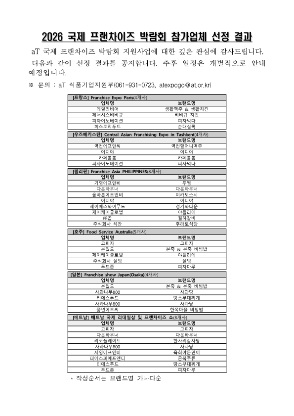 공지사항 『2026년 국제 프랜차이즈 박람회』참가업체 선정 결과 발표 관리자 일반공지 2026-02-10 15:27 109 안녕하십니까, 우리 외식기업의 건승을 기원합니다. 다음과 같이 2026 국제 프랜차이즈 박람회 선정 결과를 안내드립니다. 선정된 기업에게는 개별적으로 추후 일정에 대해 공지할 예정입니다. 감사합니다. (문의: aT 식품기업지원부 061-931-0723) 첨부파일 댓글 0/3000 이전글 2026년 1회차 음식점업 외국인 근로자 고용허가제 신청 안내 다음글 다음글이 없습니다 목록