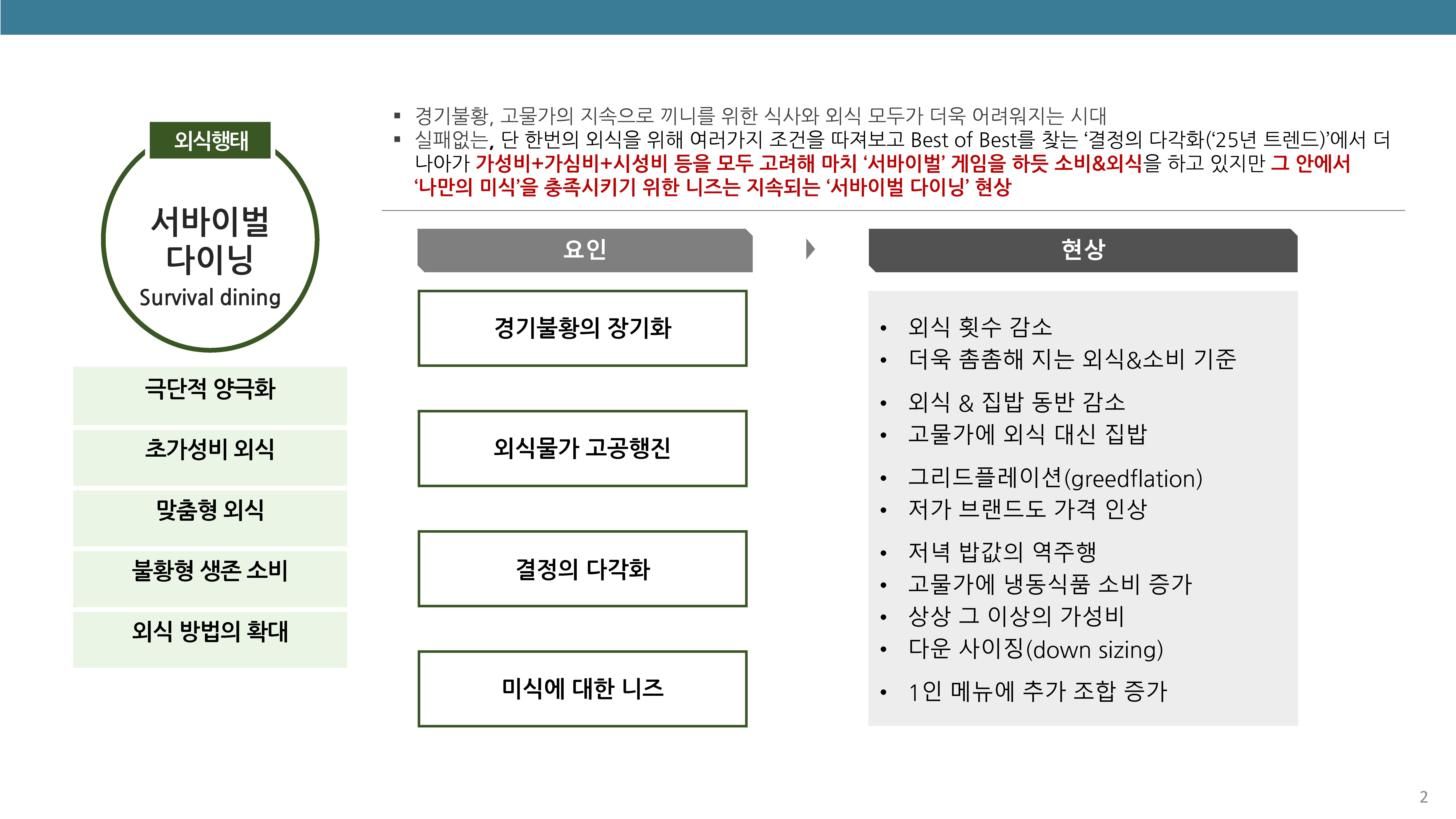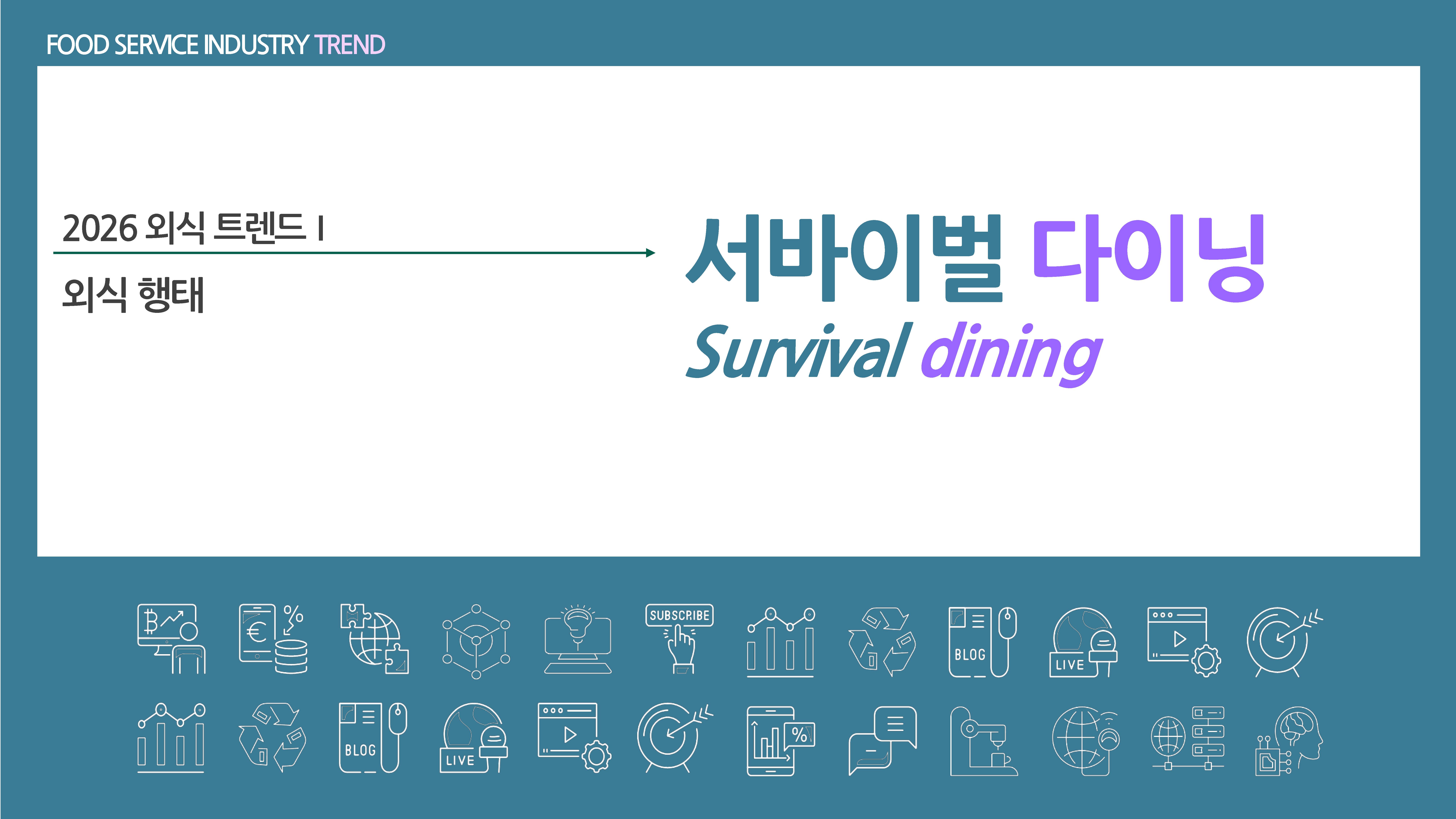 카드뉴스 국내정보 해외정보 식재료수급동향(KREI) 활용사례 2026 외식트렌드(서바이벌 다이닝) 관리자 2025-12-19 13:20 5 첨부파일 2026 외식트렌드(서바이벌다이닝).pdf다운로드 이전글 2026 외식트렌드(종합) 다음글 2026 외식트렌드(진정성 있는 미식 향유) 목록