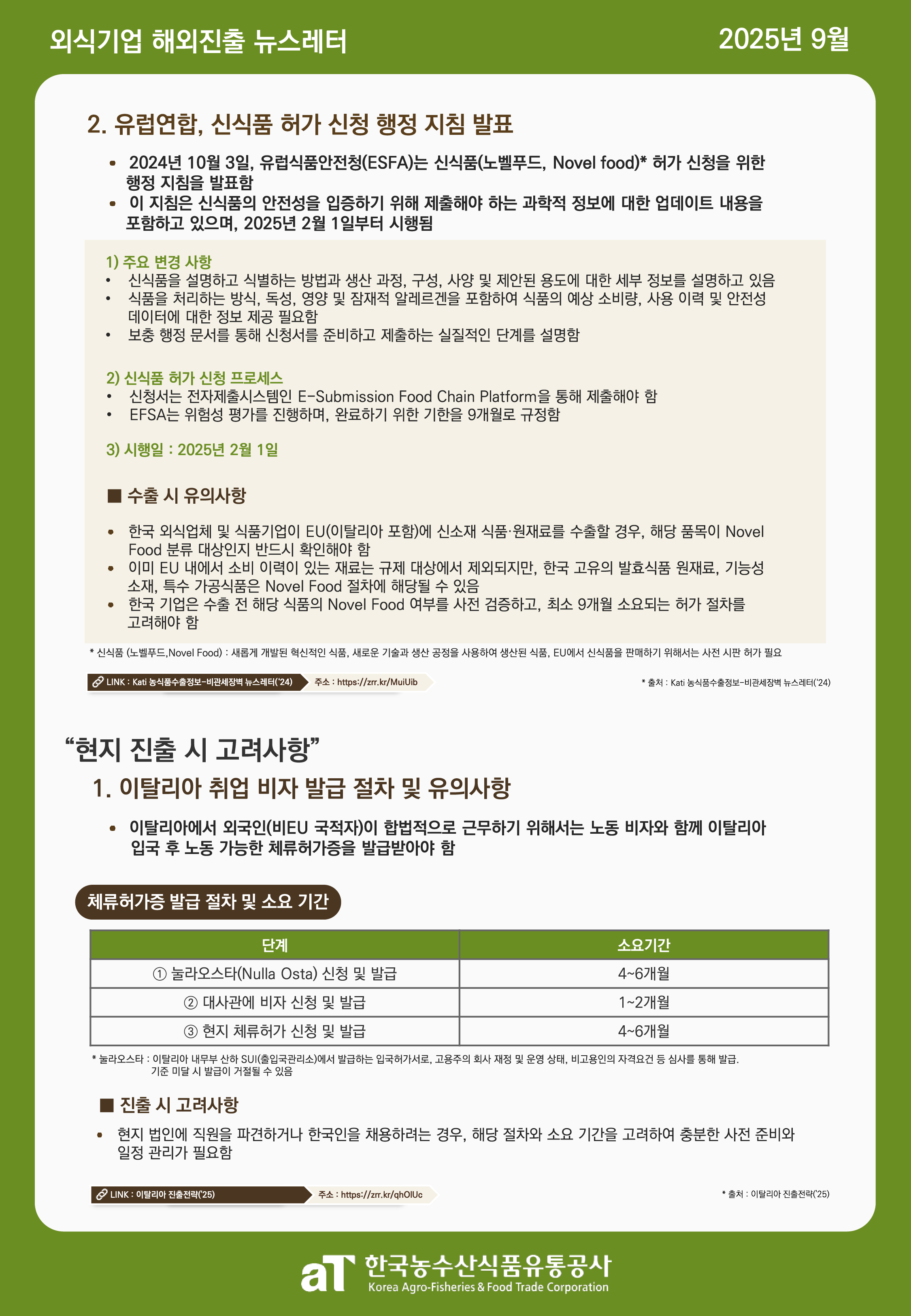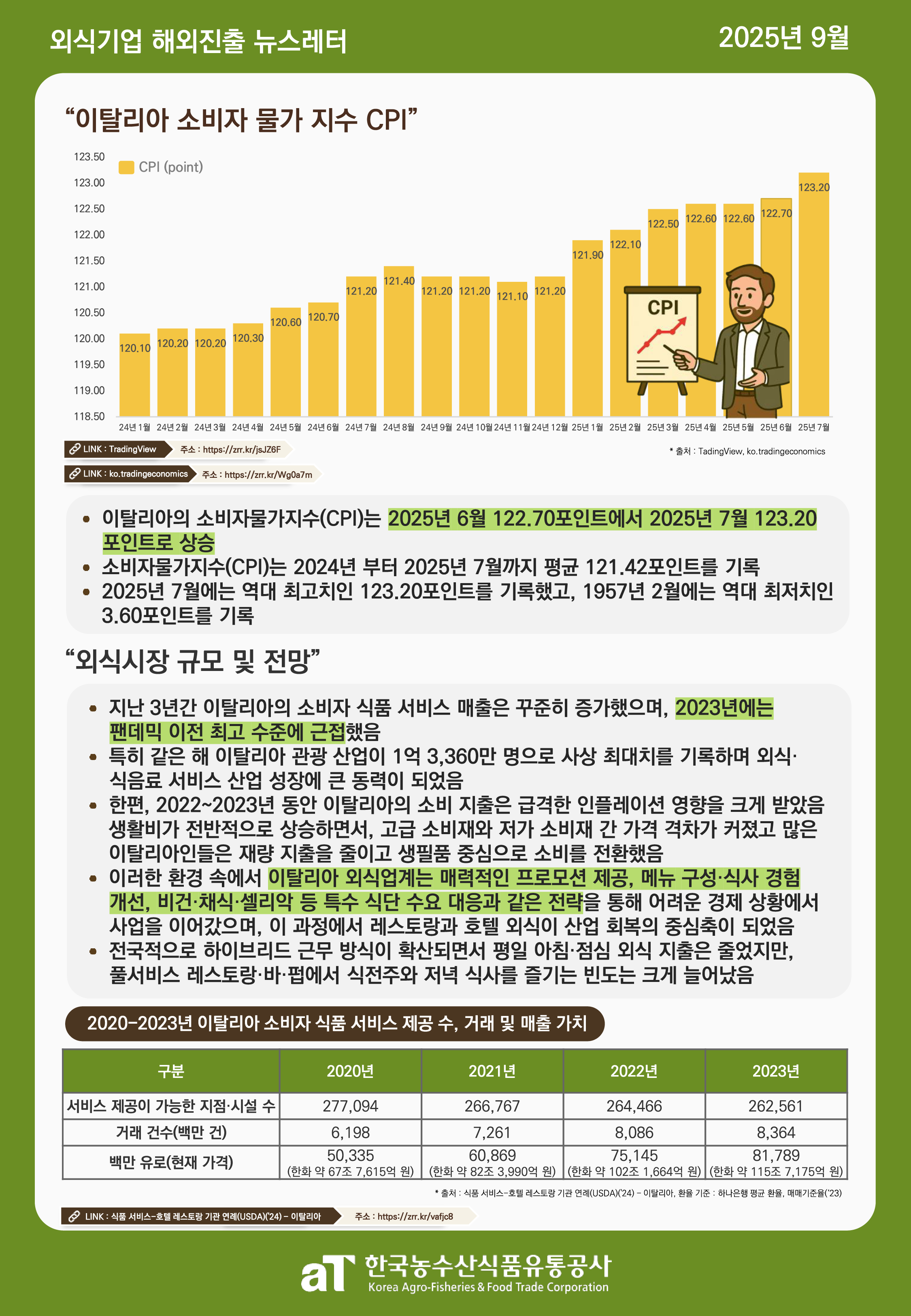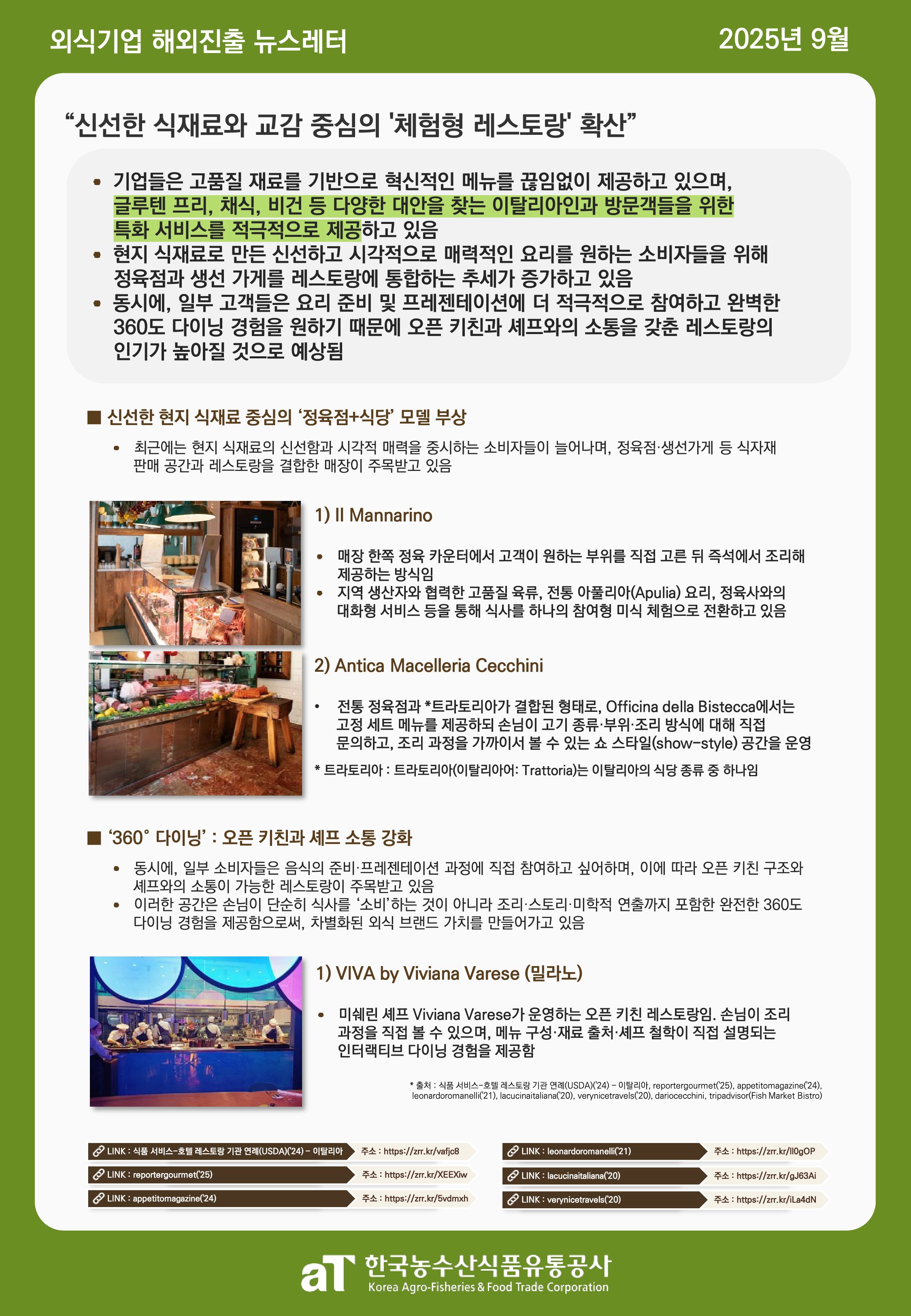 카드뉴스 국내정보 해외정보 식재료수급동향(KREI) 활용사례 2025년 9월 외식기업 해외진출 실태조사 뉴스레터 - 이탈리아 이혜정 2025-09-29 10:25 525 9월 외식기업 해외진출 실태조사 뉴스레터 "이탈리아" 뉴스레터 속 출처는 하단의 첨부파일(PDF) 파일에서 클릭하시면 바로 접속 가능합니다! 첨부파일 (25년 9월) 2025년 외식기업 해외진출 실태조사 뉴스레터 - 이탈리아.pdf다운로드 이전글 2025년 8월 외식기업 해외진출 실태조사 뉴스레터 - 사우디아라비아 다음글 다음글이 없습니다 목록