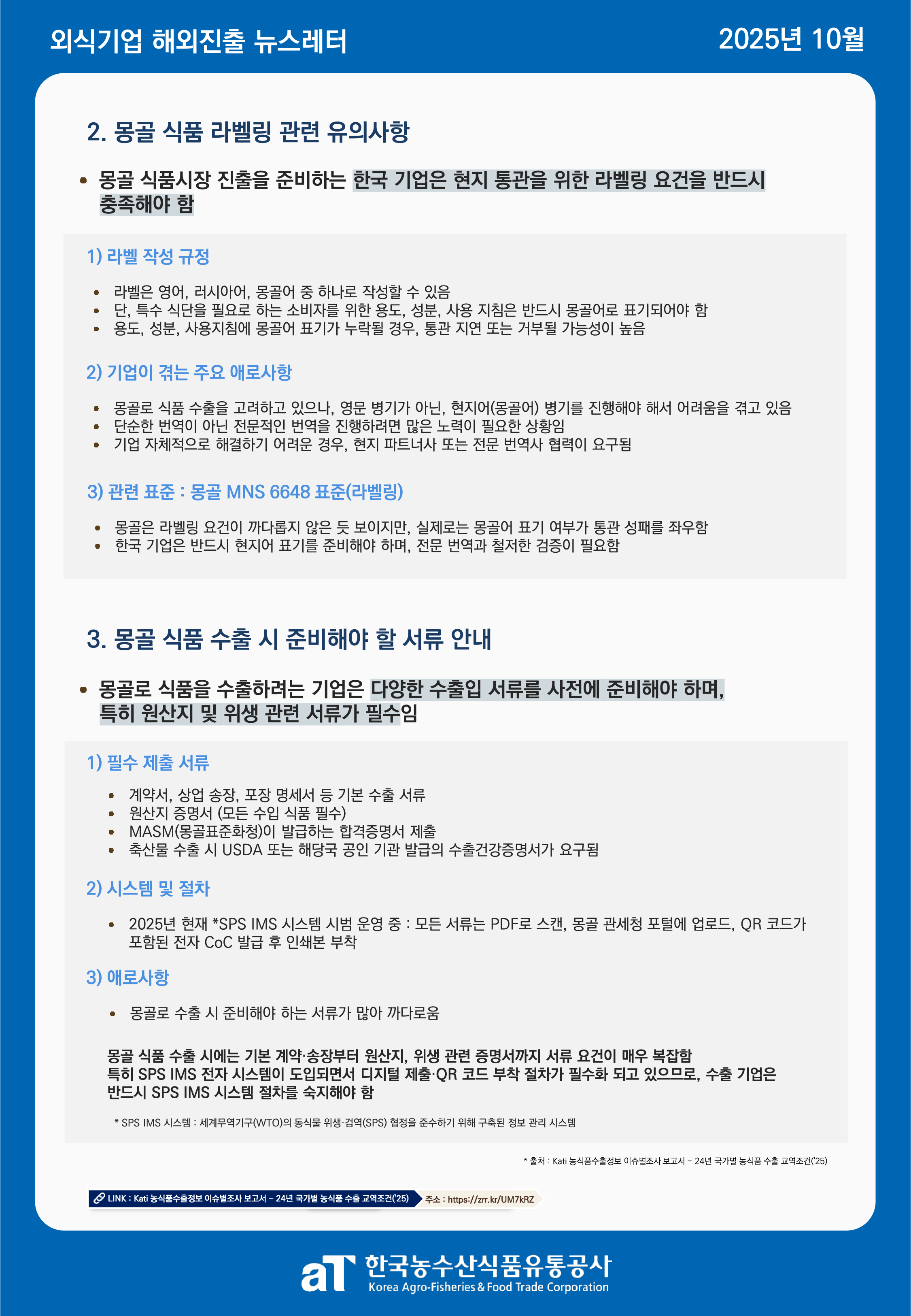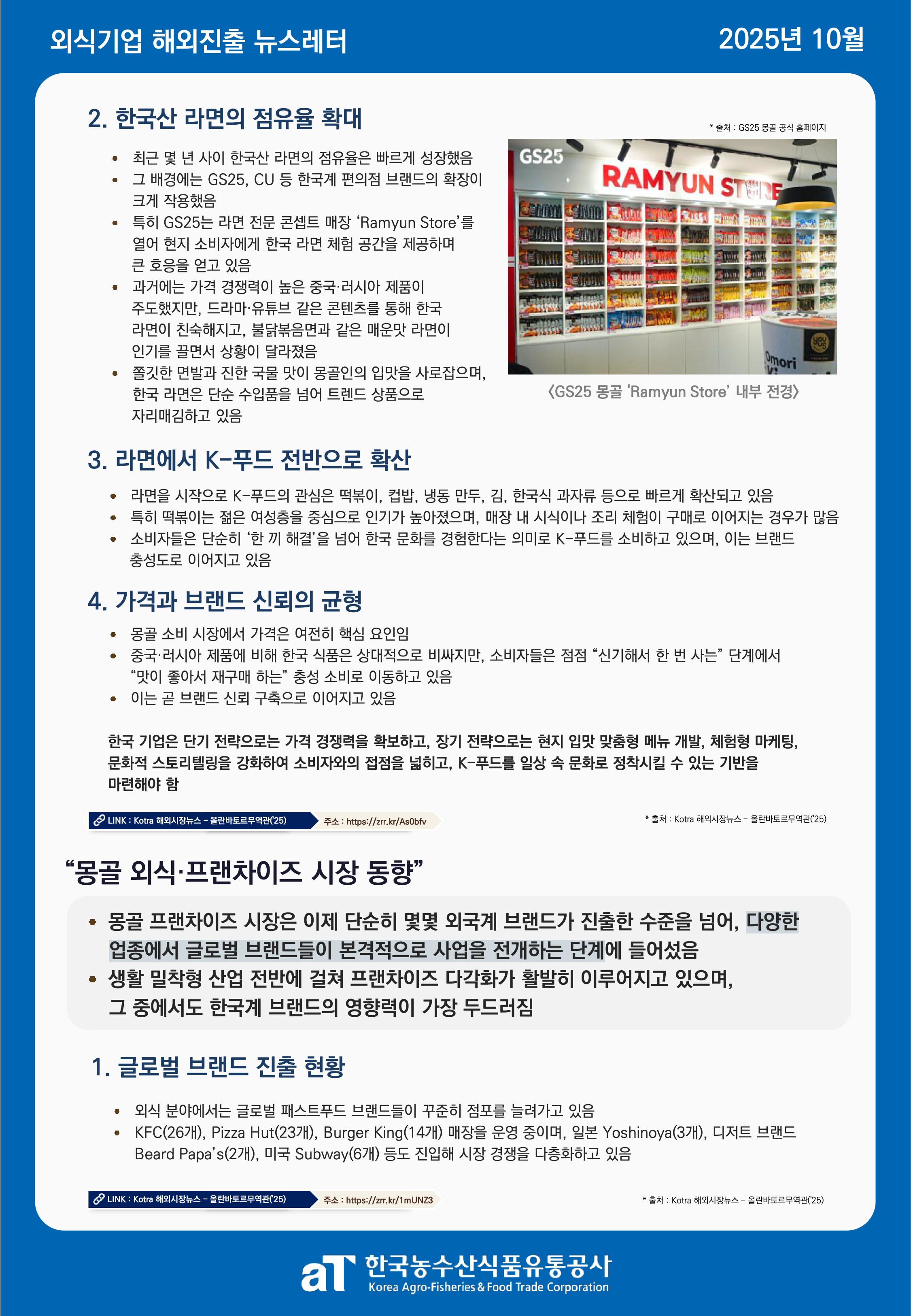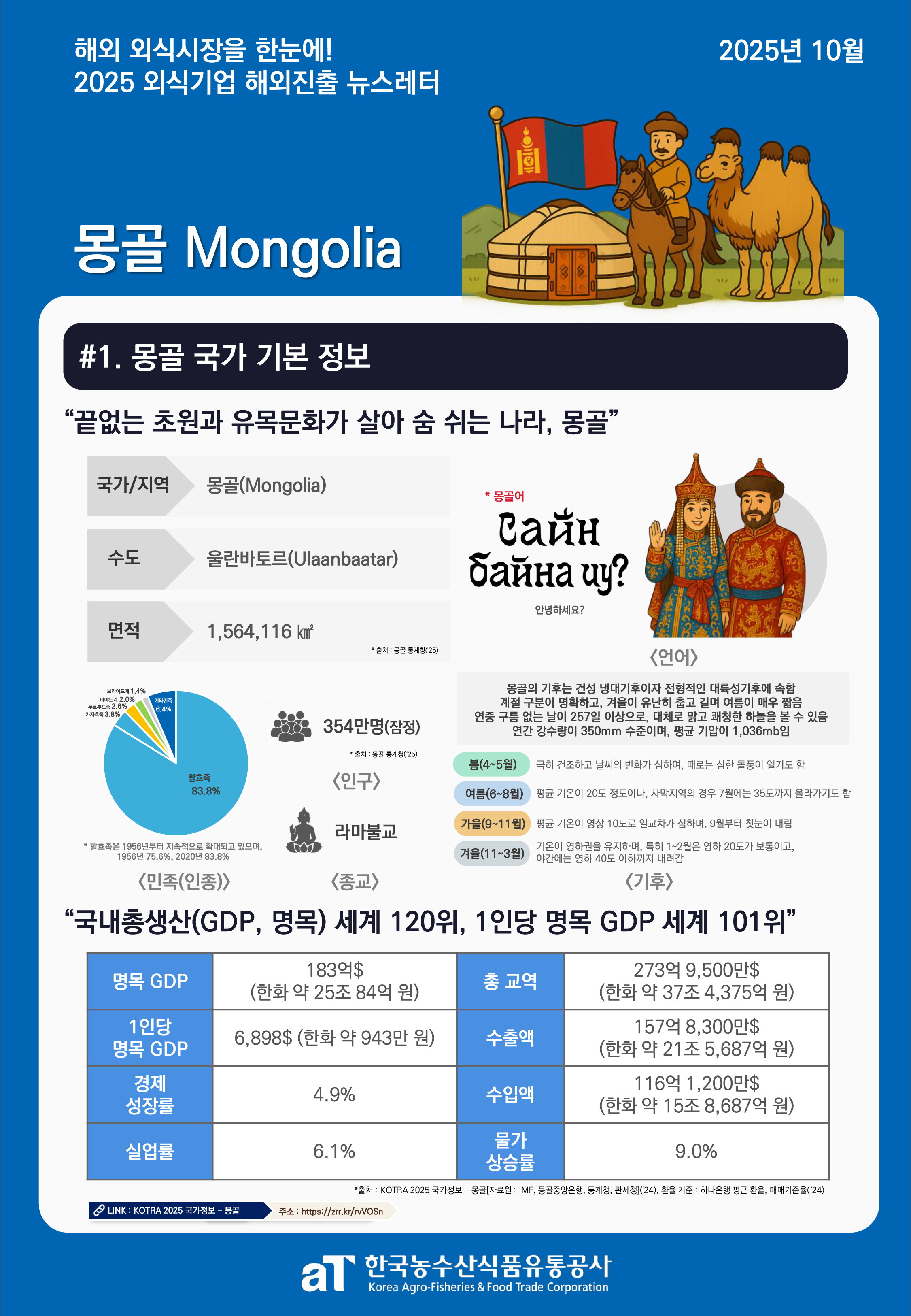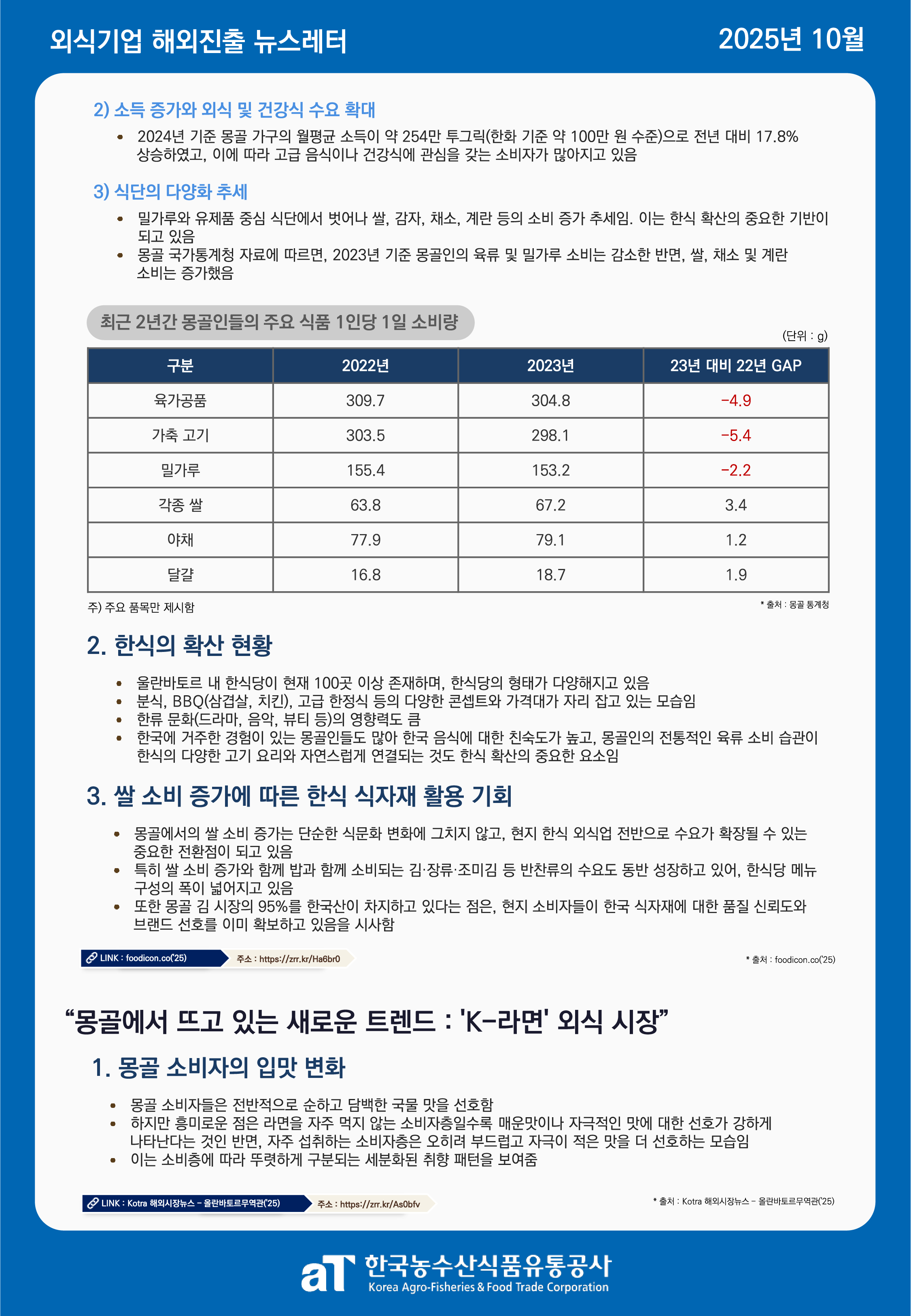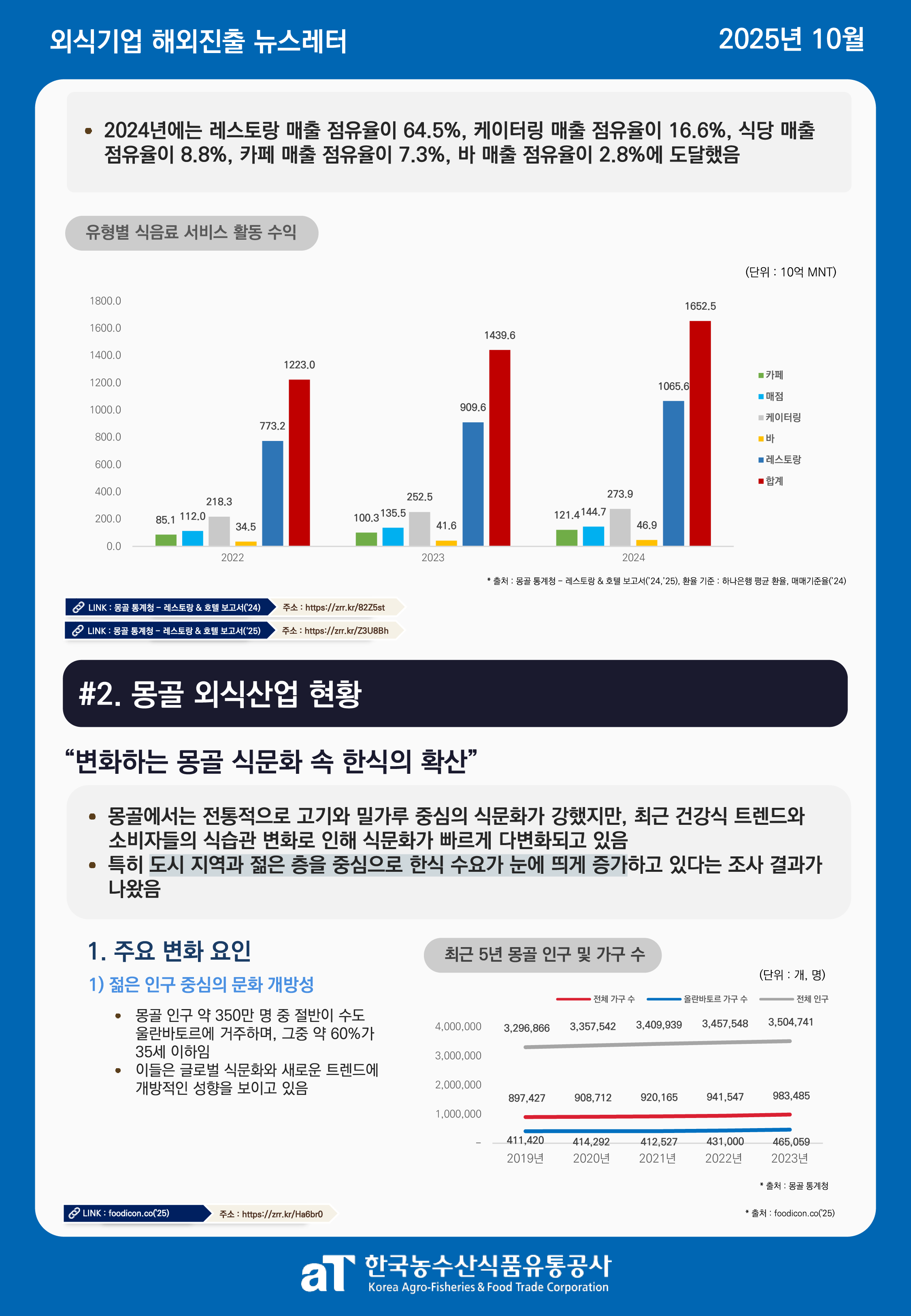 카드뉴스 국내정보 해외정보 식재료수급동향(KREI) 활용사례 2025년 10월 외식기업 해외진출 실태조사 뉴스레터 - 몽골 이혜정 2025-10-31 17:29 205 10월 외식기업 해외진출 실태조사 뉴스레터 "몽골" 뉴스레터 속 출처는 하단의 첨부파일(PDF) 파일에서 클릭하시면 바로 접속 가능합니다! 첨부파일 (25년 10월) 2025년 외식기업 해외진출 실태조사 뉴스레터 - 몽골.pdf다운로드 이전글 2025년 9월 외식기업 해외진출 실태조사 뉴스레터 - 이탈리아 다음글 다음글이 없습니다 목록
