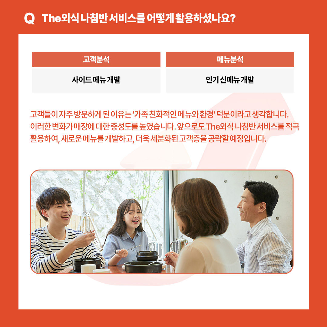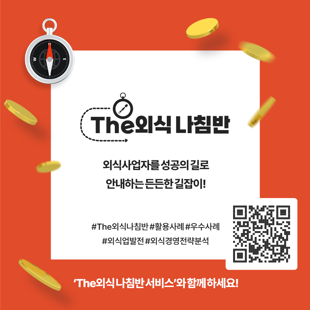 카드뉴스 국내정보 해외정보 식재료수급동향(KREI) 활용사례 [The외식 나침반] 고객 분석으로 가족 단위 고객 유치 성공! 관리자 2025-10-15 10:26 21 현직 사장님부터 외식창업을 꿈꾸는 예비사장님 모두에게 유익한 외식경영전략분석정보 'The외식 나침반' 서비스! 카드뉴스에 소개된 사례와 같은 경영혁신을 경험하고 싶으시다면, 아래 링크를 통해 직접 체험해 보세요! ↓↓↓↓↓↓↓↓ 서비스 바로가기 첨부파일 이전글 [The외식 나침반] 감에서 데이터로, 매장 매출 20% 키운 초밥집 이야기 다음글 [The외식 나침반] 고객 맞춤형 전략으로 매출 50% 증가! 목록