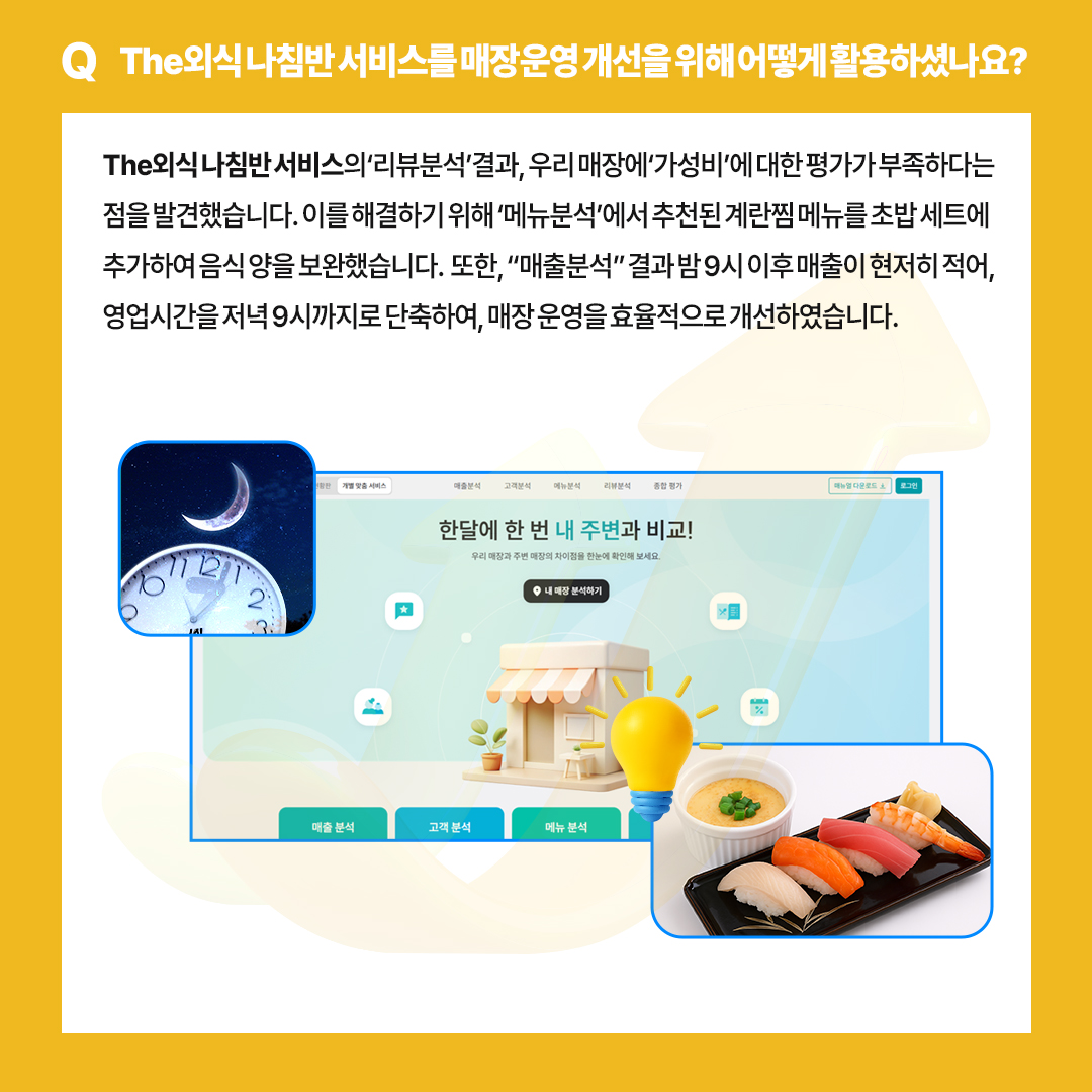 카드뉴스 국내정보 해외정보 식재료수급동향(KREI) 활용사례 [The외식 나침반] 초밥 세트 메뉴 개선으로 매출 상승! 관리자 2025-10-15 11:00 29 현직 사장님부터 외식창업을 꿈꾸는 예비사장님 모두에게 유익한 외식경영전략분석정보 'The외식 나침반' 서비스! 카드뉴스에 소개된 사례와 같은 경영혁신을 경험하고 싶으시다면, 아래 링크를 통해 직접 체험해 보세요! ↓↓↓↓↓↓↓↓ 서비스 바로가기 첨부파일 이전글 [The외식 나침반] 신규 고객 유치 비결, 사이드 메뉴 전략! 다음글 [The외식 나침반] 뜨는 메뉴 분석으로 30% 매출 신장! 목록
