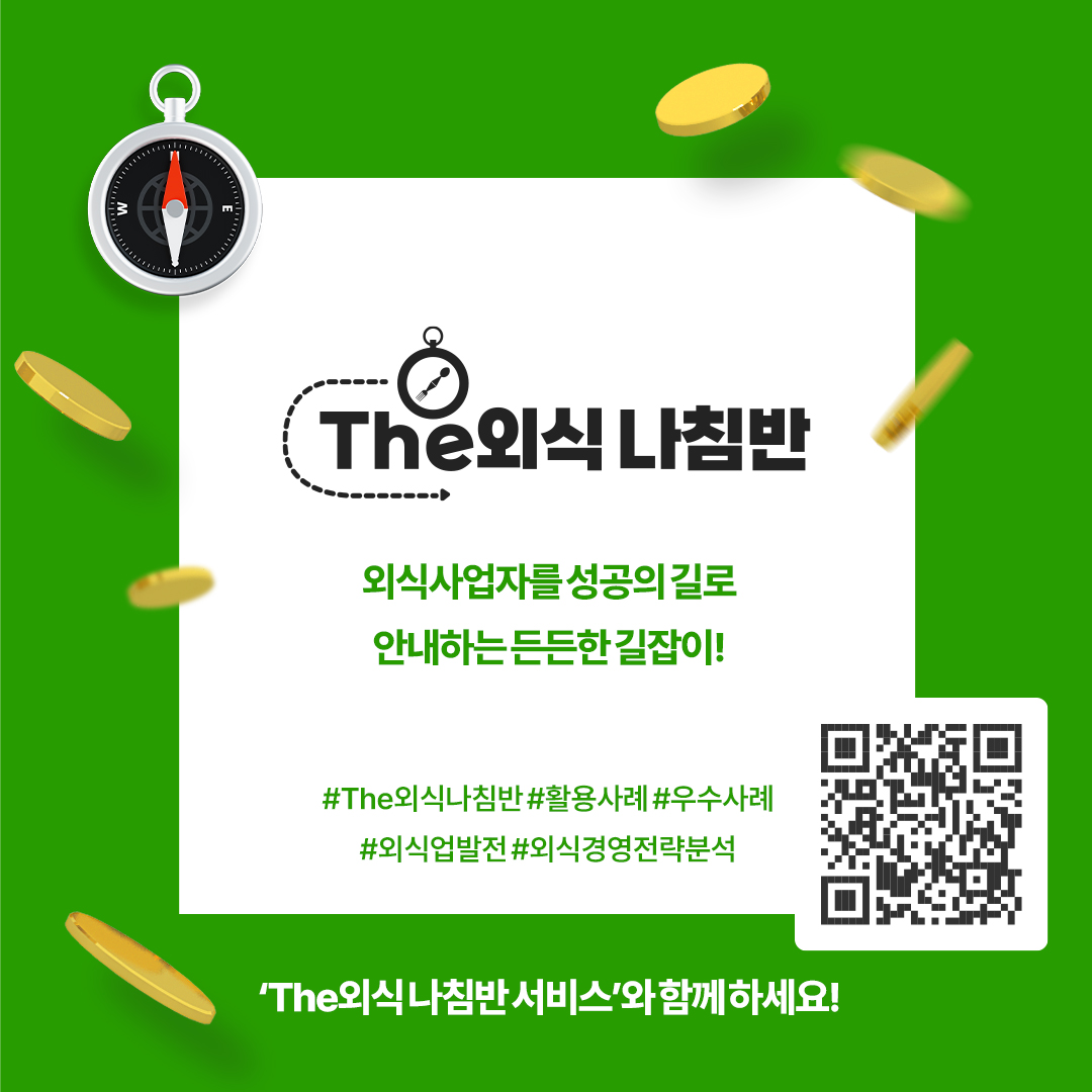 카드뉴스 국내정보 해외정보 식재료수급동향(KREI) 활용사례 [The외식 나침반] 단점을 강점으로, 고객 만족은 배가! 관리자 2025-10-15 14:34 109 현직 사장님부터 외식창업을 꿈꾸는 예비사장님 모두에게 유익한 외식경영전략분석정보 'The외식 나침반' 서비스! 카드뉴스에 소개된 사례와 같은 경영혁신을 경험하고 싶으시다면, 아래 링크를 통해 직접 체험해 보세요! ↓↓↓↓↓↓↓↓ 서비스 바로가기 첨부파일 이전글 [The외식 나침반] 뜨는 메뉴 분석으로 30% 매출 신장! 다음글 [The외식 나침반] 커피에 베이커리를 더하니 토요일 매출이 열렸다! 목록
