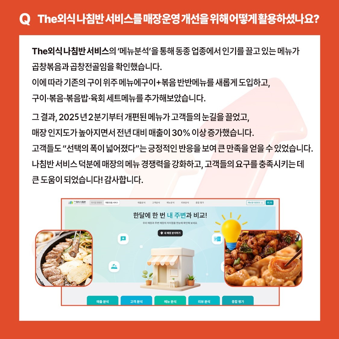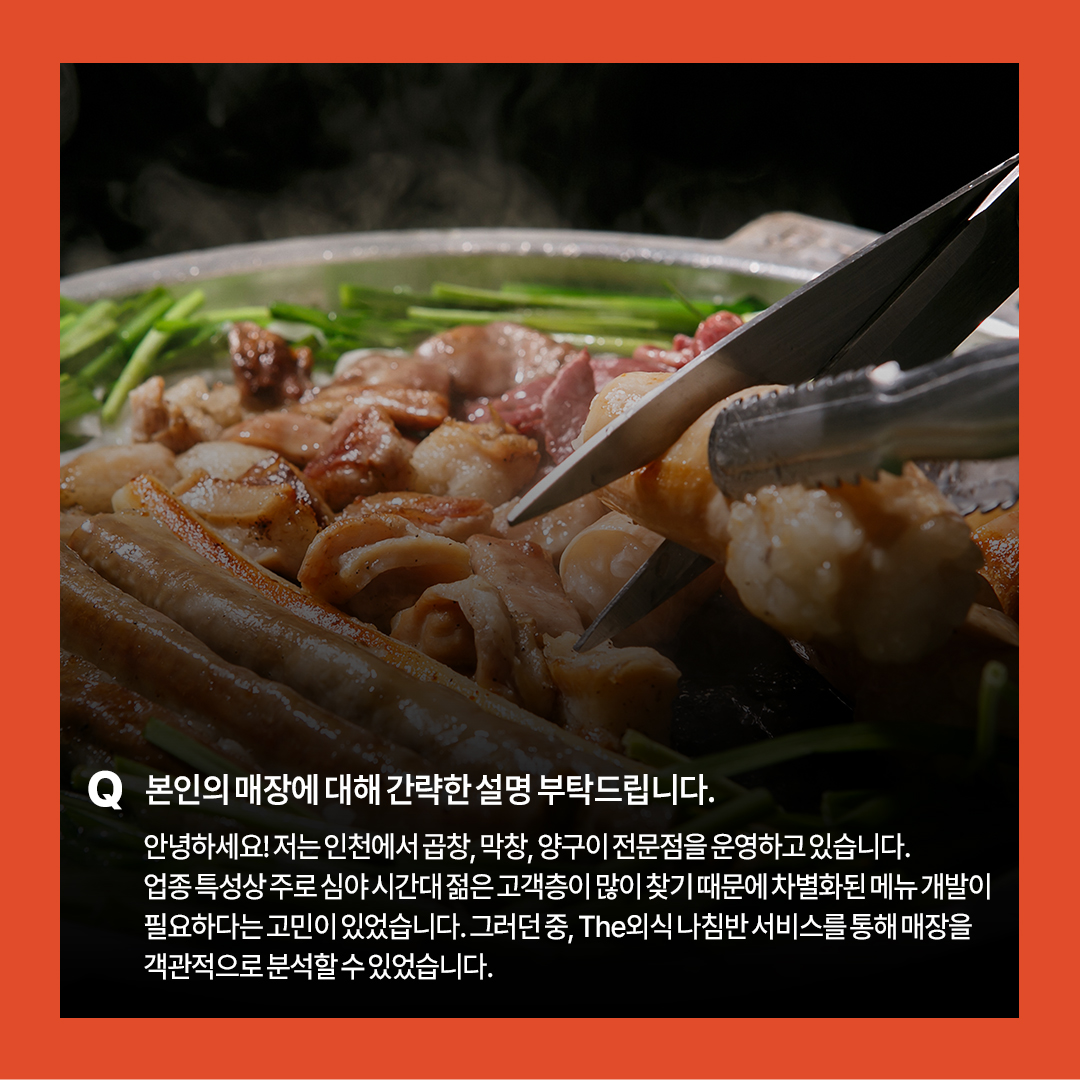 카드뉴스 국내정보 해외정보 식재료수급동향(KREI) 활용사례 [The외식 나침반] 뜨는 메뉴 분석으로 30% 매출 신장! 관리자 2025-10-15 14:31 9 현직 사장님부터 외식창업을 꿈꾸는 예비사장님 모두에게 유익한 외식경영전략분석정보 'The외식 나침반' 서비스! 카드뉴스에 소개된 사례와 같은 경영혁신을 경험하고 싶으시다면, 아래 링크를 통해 직접 체험해 보세요! ↓↓↓↓↓↓↓↓ 서비스 바로가기 첨부파일 이전글 [The외식 나침반] 초밥 세트 메뉴 개선으로 매출 상승! 다음글 [The외식 나침반] 단점을 강점으로, 고객 만족은 배가! 목록