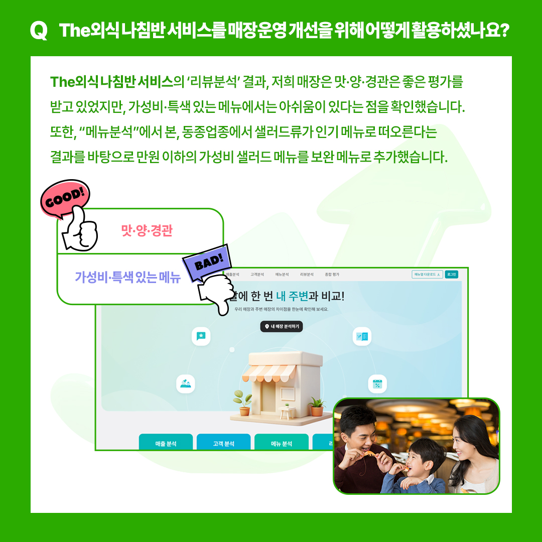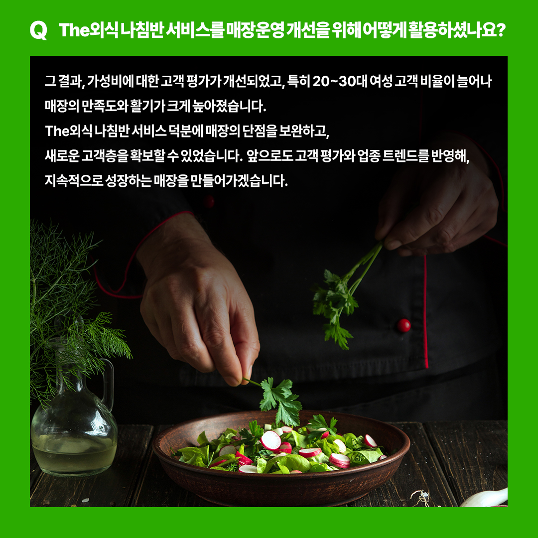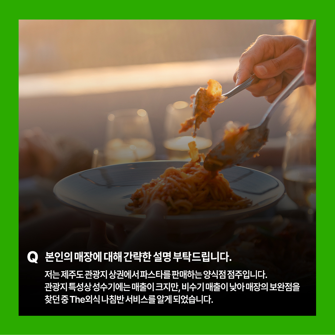 카드뉴스 국내정보 해외정보 식재료수급동향(KREI) 활용사례 [The외식 나침반] 단점을 강점으로, 고객 만족은 배가! 관리자 2025-10-15 14:34 12 현직 사장님부터 외식창업을 꿈꾸는 예비사장님 모두에게 유익한 외식경영전략분석정보 'The외식 나침반' 서비스! 카드뉴스에 소개된 사례와 같은 경영혁신을 경험하고 싶으시다면, 아래 링크를 통해 직접 체험해 보세요! ↓↓↓↓↓↓↓↓ 서비스 바로가기 첨부파일 이전글 [The외식 나침반] 뜨는 메뉴 분석으로 30% 매출 신장! 다음글 [The외식 나침반] 커피에 베이커리를 더하니 토요일 매출이 열렸다! 목록